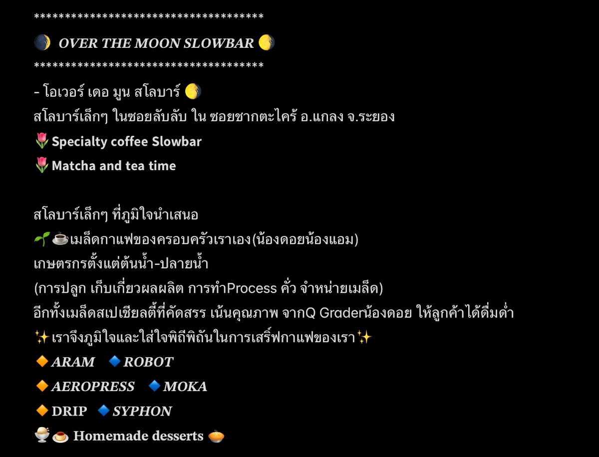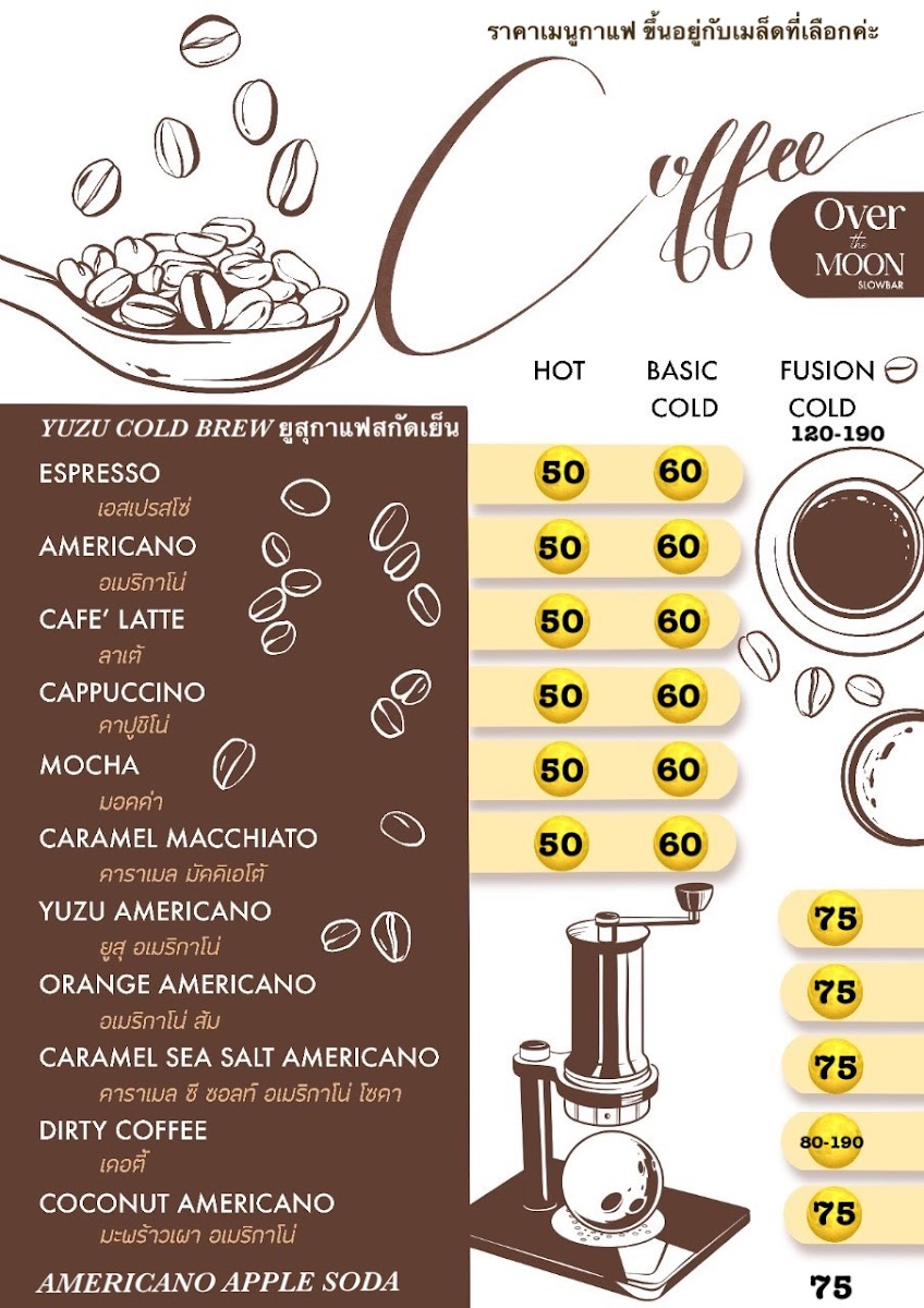 Over the moon Slowbar กาแฟสโลว์บาร์ จำหน่ายเมล็ด is a gem nestled in Klaeng District, Rayong, offering an exceptional specialty coffee experience. Their menu highlights a diverse selection of freshly roasted coffee beans, from light to medium roasts, sourced directly from the owners' own northern Thai coffee farms and curated by skilled roasters. This farm-to-cup approach ensures a deep, clean flavor in every cup.
